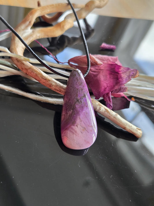 Hübscher seltener Sugilith Anhänger tropfenförmig, 44 x 19 x 8 mm, gebohrt, an verstellbarem Lederband