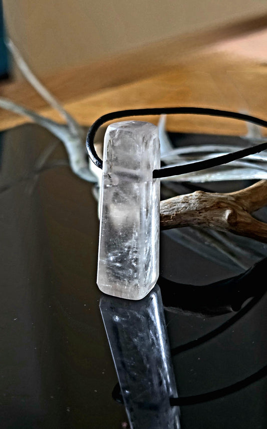 Weißer Kunzit Spodumen Kristall Stäbchen Anhänger, 37 x 11 x 11 mm, gebohrt, an verstellbarem Lederband