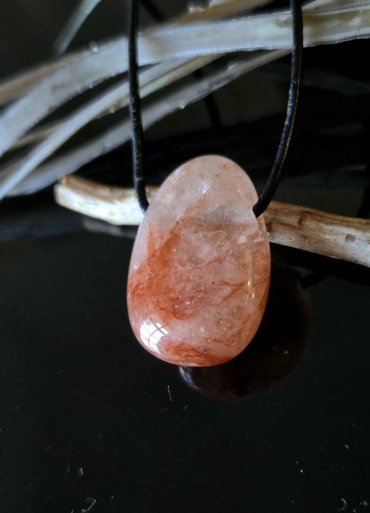Red Healer, Harlekin Quarz, Bergkristall mit Hämatit Kristall Feuerquarz Anhänger, 29 x 20 x 10 mm, gebohrt, an verstellbarem Lederband