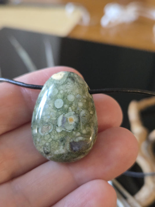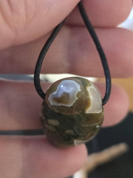 Regenwaldrhyolith Regenwald Rhyolit mit Opalschicht Anhänger, 32 x 19 x 9 mm, gebohrt, an verstellbarem Lederband