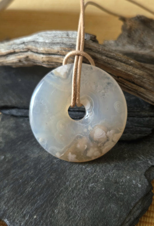 Zauberhafter Kirschblüten Achat Sakura Blumenachat Donut Anhänger groß, 42 x 7 mm, an verstellbarem Lederband