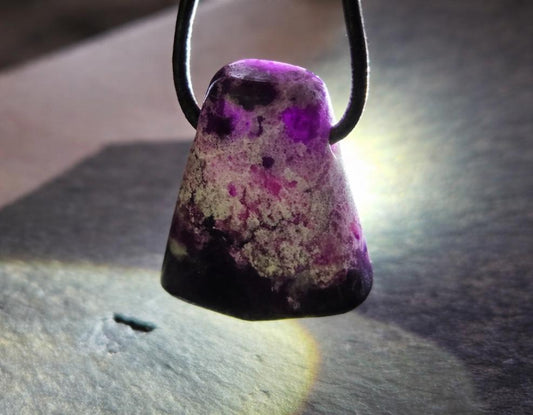 Seltener Gel Sugilith Anhänger, 26 x 22 x 9 mm, gebohrt, an verstellbarem Lederband, beidseitig tragbar