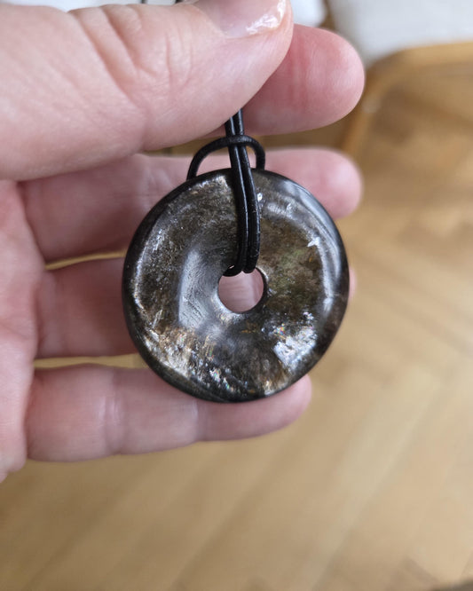 Selten! Muskovit in Biotit und Schwarzglimmergestein Anhänger Donut, 40 x 5 mm, an verstellbarem Lederband