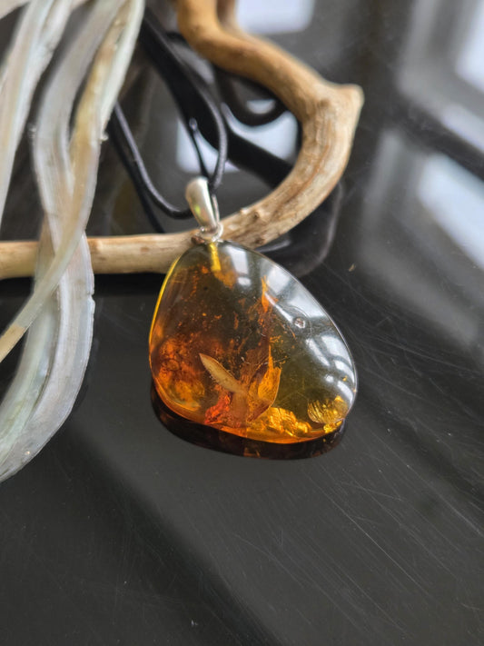 Baltischer Bernstein Anhänger, mit Einschlüssen von Blüten Bernstein Amulett, 43 x 30 x 10 mm, 925er Silberöse, an verstellbarem Lederband