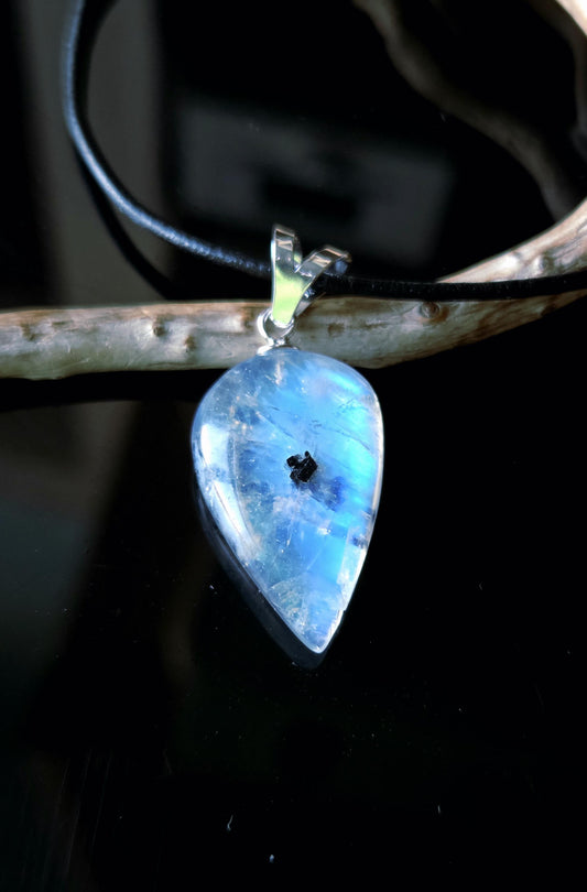 Kleiner Regenbogen Mondstein weißer Labradorit mit schwarzem Turmalin Anhänger, an 925er SilberÖse, an verstellbarem Lederband