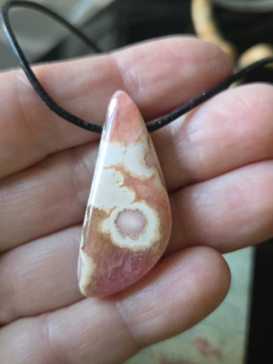 Entzückender Rhodochrosit Anhänger, 40 x 17 x 8 mm, gebohrt, an verstellbarem Lederband