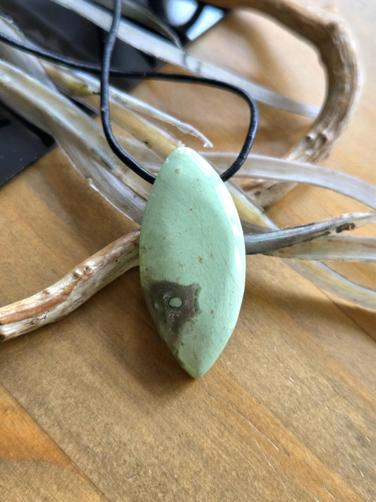 Seltener Variscit, Variscite, Variszit Navetteförmig Anhänger, 40 x 19 x 8 mm, gebohrt, an verstellbarem Lederband