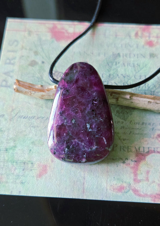 Magischer Rubin in Zoisit, Anhänger, 39 x 26 x 10 mm, gebohrt, an verstellbarem Lederband
