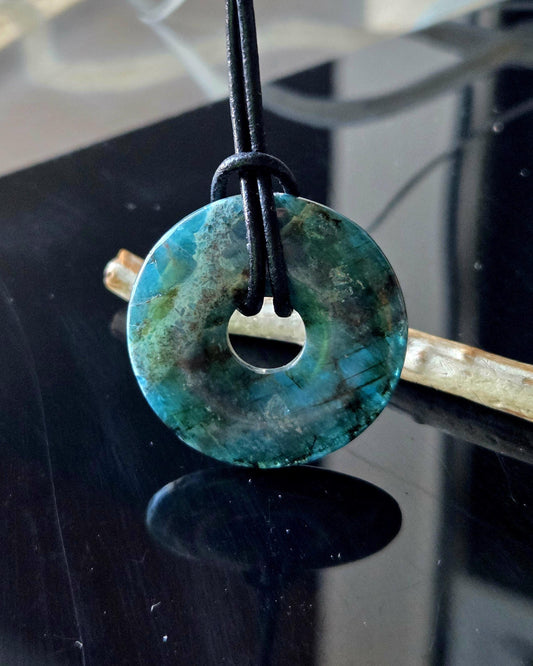 Apatit mit Shattuckit Donut Anhänger, 30 x 5 mm, gebohrt, an verstellbarem Lederband, selten!!