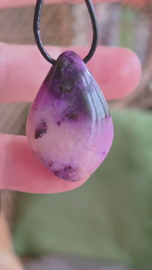 Hübscher Sugilith Anhänger tropfenförmig, 34 x 19 x 6 mm, gebohrt, an verstellbarem Lederband