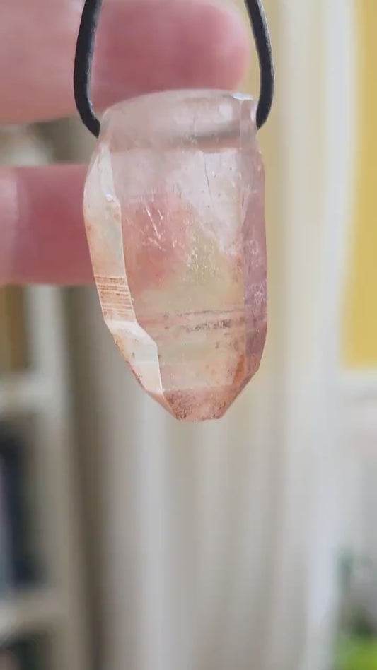 Rhodonit in Quarz Anhänger, 32 x 18 x 16 mm, gebohrt, an verstellbarem Lederband