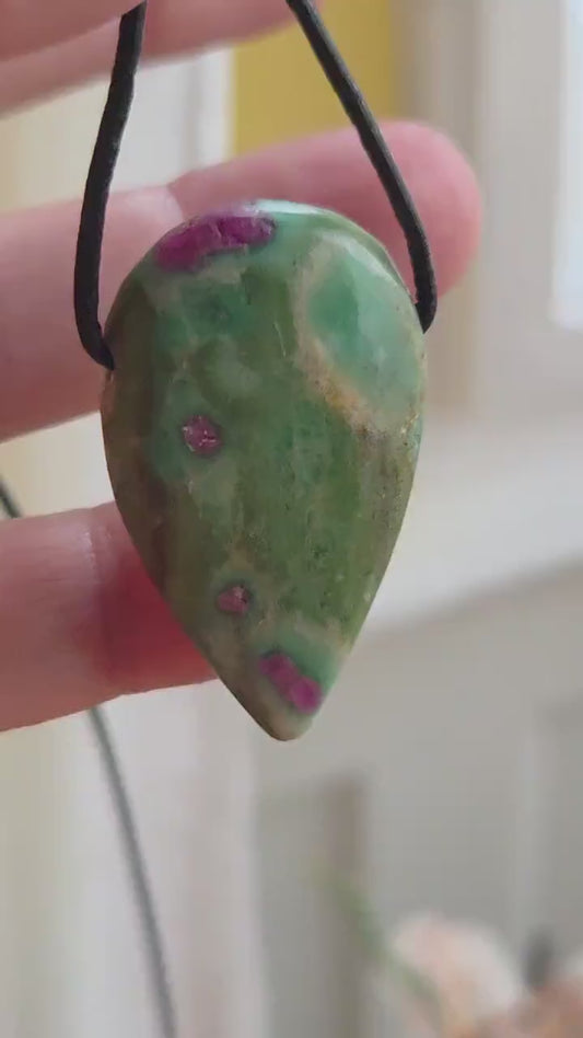 Rubin in Fuchsit Anhänger, tropfenförmig, 38 x 23 x 8 mm, gebohrt, an verstellbarem Lederband